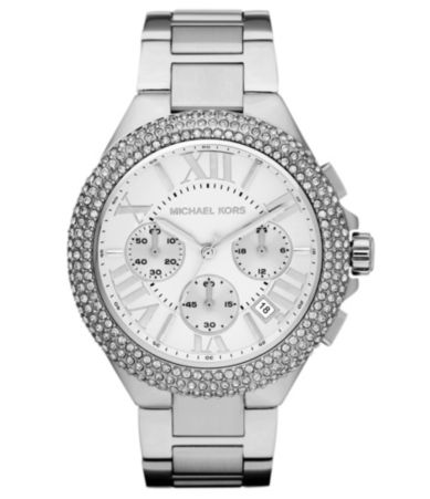 Michael Kors Camille Light-Silver Dial Chronograph Watch : Silvertone roman numerals on a white dial add to the polished and sophisticated look of the Camille chronograph watch from Michael Kors. It features clear pave crystal insets on the silvertone round bezel. round case silvertone bracelet and dial chro We is pleased to present the quality Michael Kors Camille Light-Silver Dial Chronograph Watch today at this kind of special price.